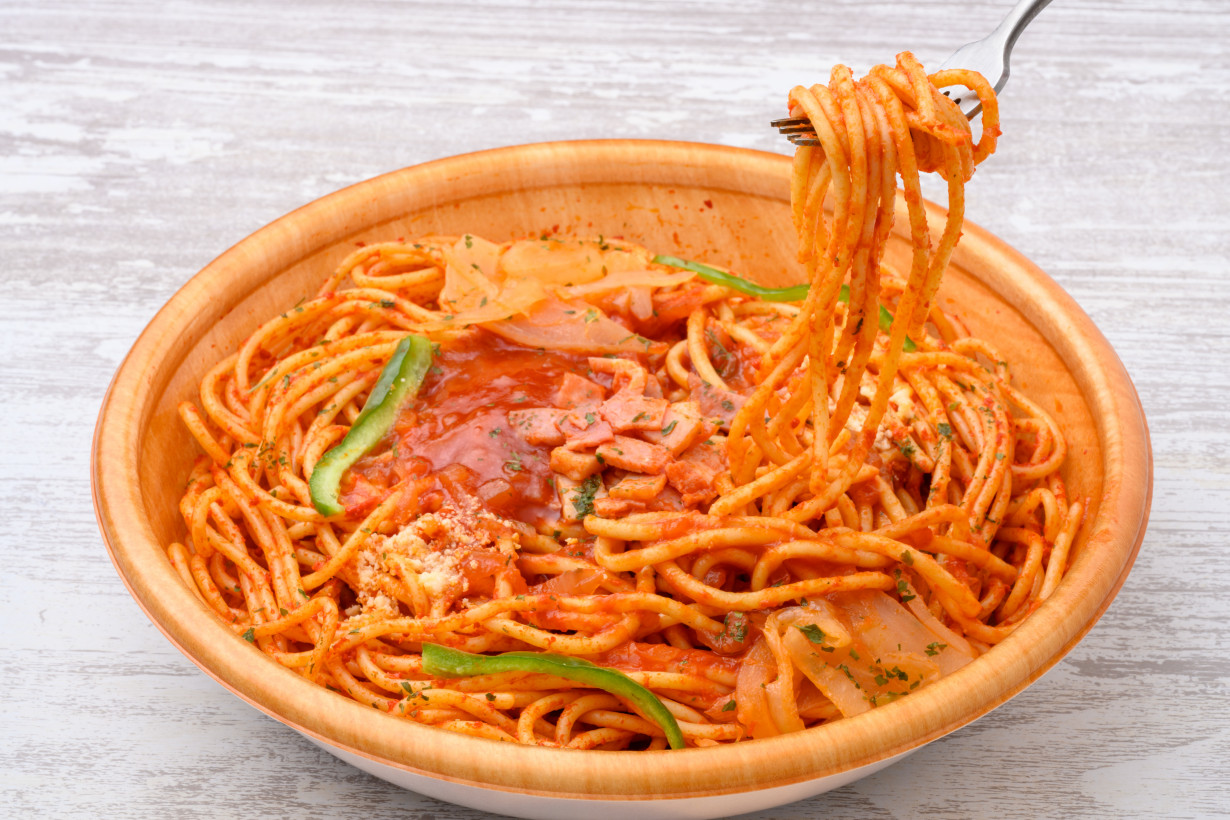 また、「増量 昔ながらのナポリタン」もおすすめです。こちらも「お値段そのままデカくてうまい!!だいたい40%増量作戦」対象商品。ケチャップなどで炒めた香ばしい味わいのナポリタンです。ベーコン、玉ねぎ、ピーマン等をトッピング。内容量をだいたい40%増量しました。