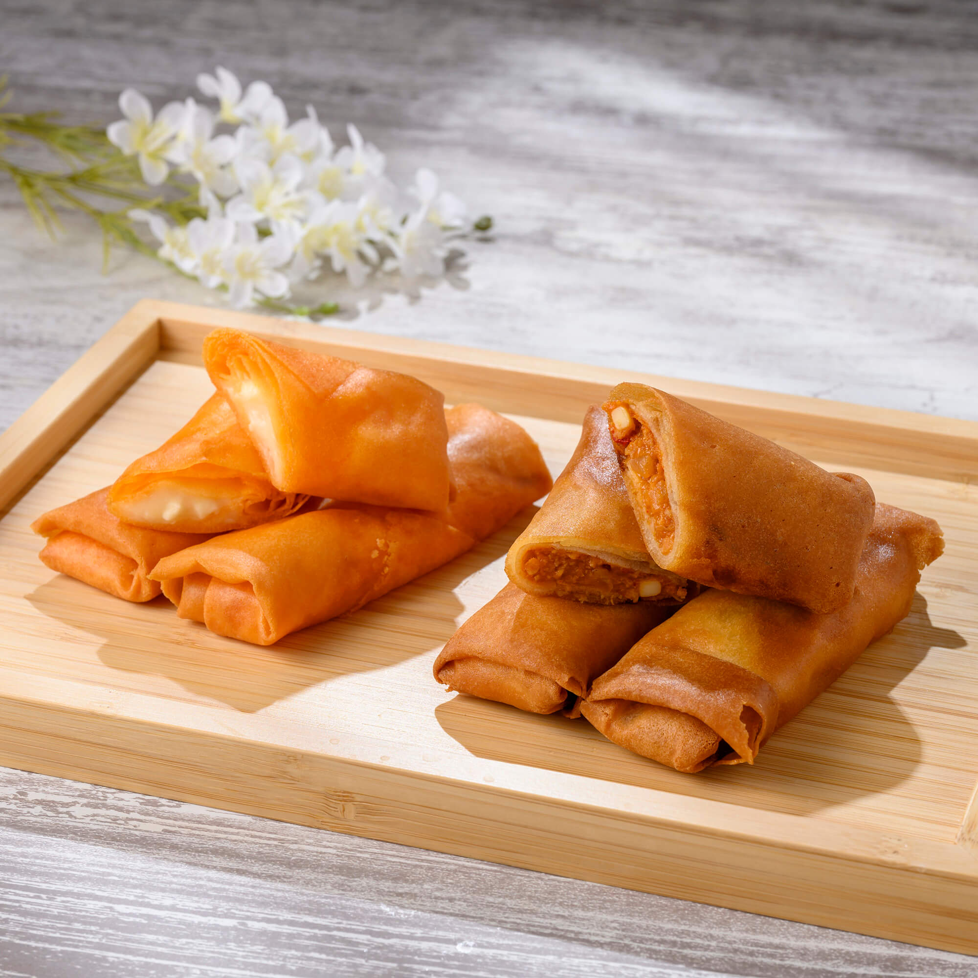 今回のおすすめは、プロセスチーズを包んだ揚げ春巻きの「チーズロール」と タコソースでピリッとスパイシーに炒められた挽き肉、甘みのある玉ねぎ、チーズが包まれた揚げ春巻きの「タコスロール」の2アイテム!手軽にワンハンドで食べられる商品です。