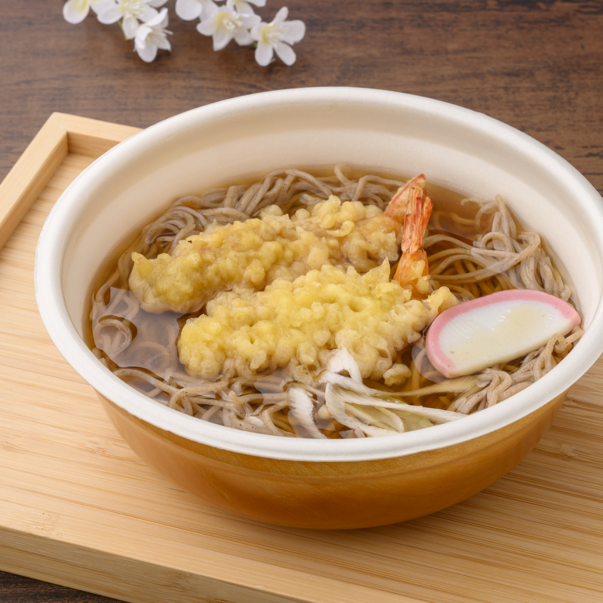 また、「だし香る海老天そば」もおすすめです。石臼挽きのそば粉を使用した歯切れの良い食感と風味豊かなそばとだしのきいたつゆの組合せに海老天、ねぎ、かまぼこをトッピングしました。