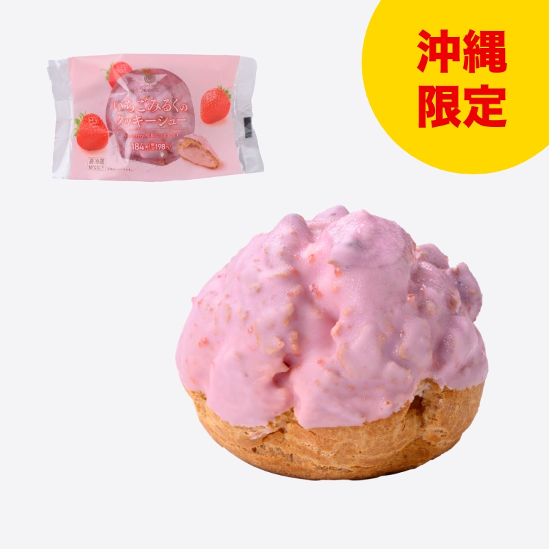 苺の果肉感のあるいちごみるくクリームが入ったクッキーシューです。
