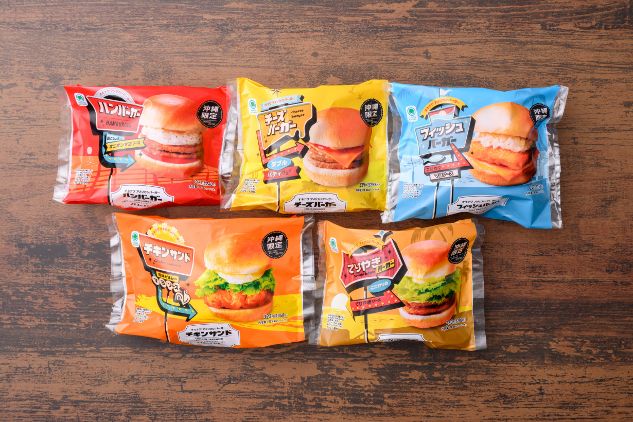 カラフルなパッケージが目をひく「オキナワアメリカンバーガー」シリーズ。昔ながらのアメリカンテイストなハンバーガーをイメージし、包装デザインを統一。もちろん中身のバーガーも食べ応え抜群です!定番の「ハンバーガー」は、ケチャップとオニオンマヨの組み合わせが美味しい一品。他にも、アメリカンマスタードがアクセントの「チーズバーガー」、オニオンマヨとマスタードが相性抜群な「フィッシュバーガー」などなど、美味しいバーガーが勢揃い!