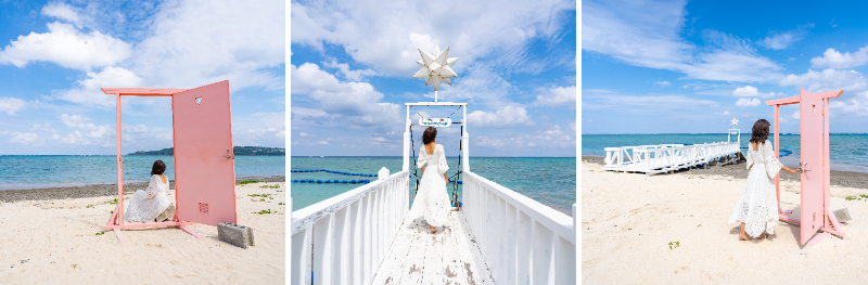 今帰仁村にある天然ビーチ「ウッパマビーチ」。ウッパマは沖縄の方言で「大きな浜」を意味し、1㎞以上続く真っ白な砂浜が魅力です。浜にはピンク色のドアや白い桟橋があり、写真映えスポットとしても注目されています。遊泳期間中はハブクラゲ侵入防止ネットや監視員も配置されており、小さなお子様連れのご家族も安心して利用できます。