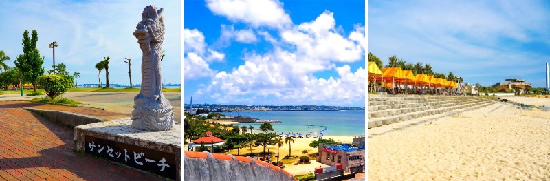 北谷町の美浜アメリカンビレッジに隣接している「サンセットビーチ」。県内屈指の夕陽スポットとしても知られ、東シナ海に沈む夕陽を望むことができます。海水浴はもちろん、夏期はビーチサイドでのバーベキューを楽しむことも◎。
