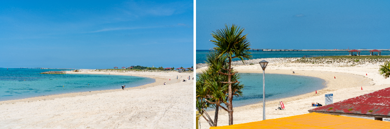 ANAインターコンチネンタル石垣リゾート敷地内にある、約700mの人工ビーチ。真っ青な海と空、白い砂浜、ビーチパラソルが並ぶ様子はまさに南国風景。ホテルの宿泊客以外も利用可能で、マリンアクティビティやレンタル用品を利用して気軽にリゾート気分を満喫することができます。シーズン中は監視員やクラゲ防止ネットも設置しているので、小さなお子様も安心して海水浴を楽しめます。