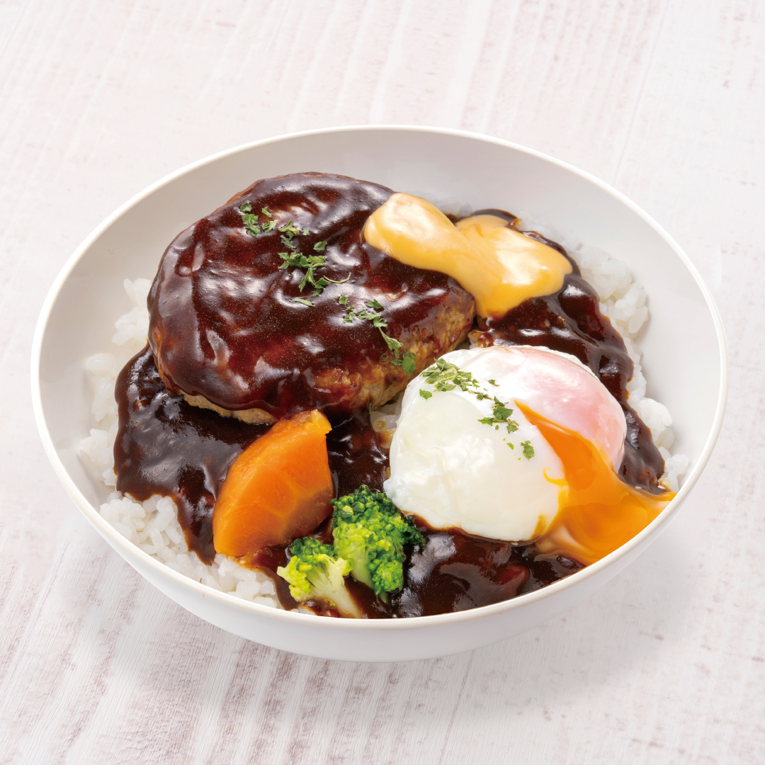 たまごのとろーり感と鉄板焼ハンバーグ、肉の旨味が効いたデミグラスソースと合わせた洋風どんぶりです。