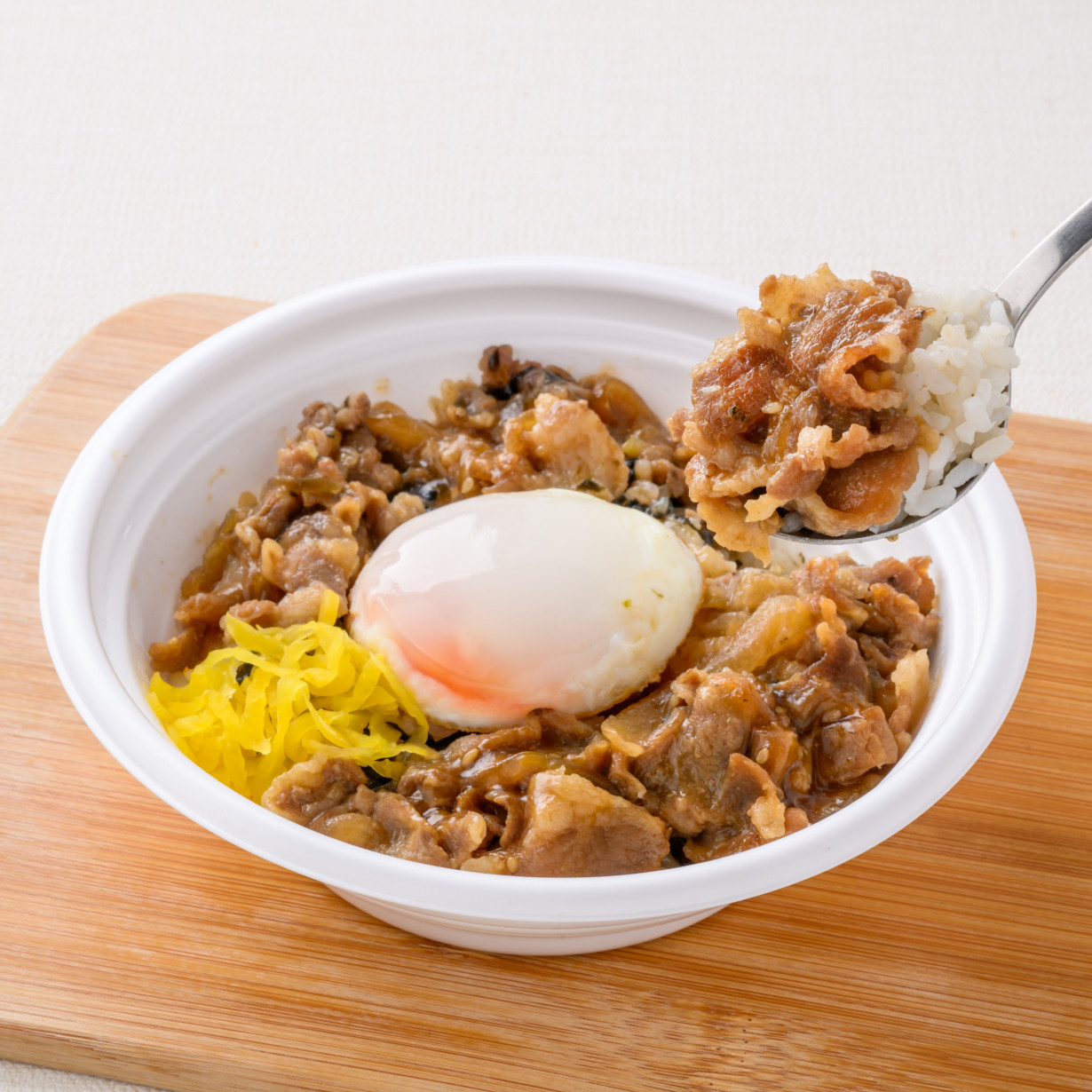 今週のおすすめは「半熟卵の豚焼肉丼」です。豚こま肉と玉葱を甘さとコクのあるたれで味付した豚焼肉に、相性の良い半熟卵を組み合わせました。