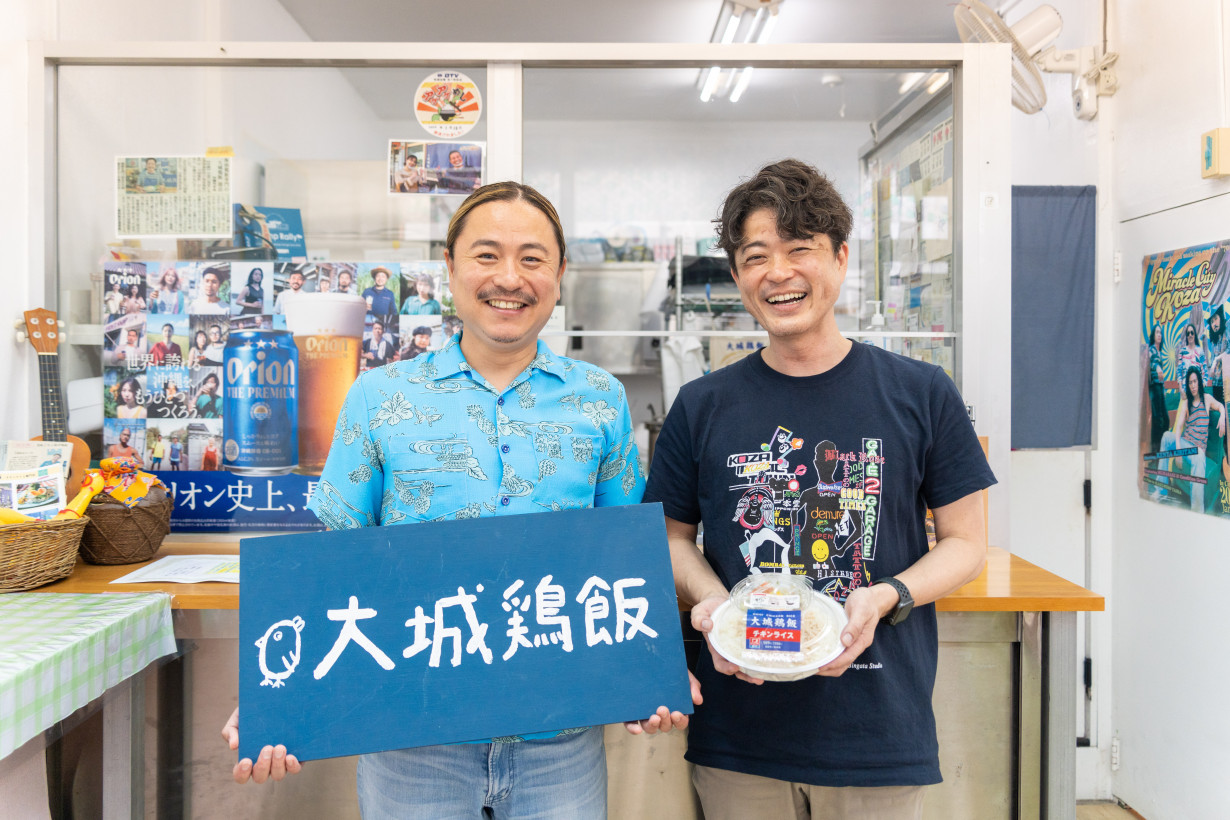 大城鶏飯は「美味しい鶏飯のお店」として有名。そして店主の大城さん自身も、某お酒メーカーのCMや映画の悪役として出演していて有名なんですね(笑)僕自身もコザで遊ぶことが多くて、共通の知人もいたので、お店の存在も大城さんの存在も知っていたんです。実際にこのお店の鶏飯を食べたらすごく美味しくて!「これは新しいコザの看板グルメだ!」「この美味しさをもっと多くの人に知ってほしい!」と思い、お声がけさせていただきました。