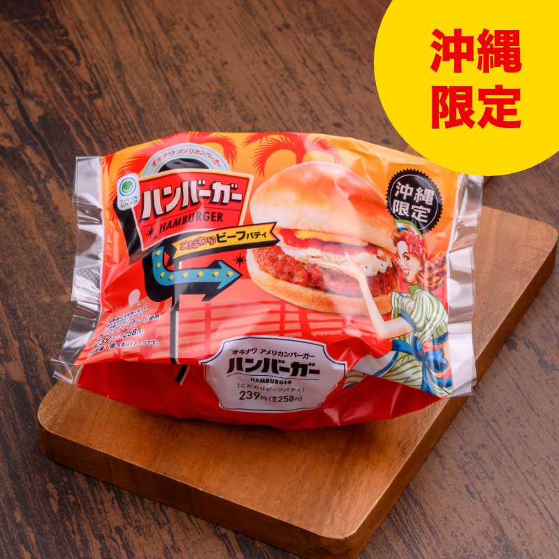 オキナワアメリカンバーガーシリーズ。自社で焼成したこだわりのビーフパティを使用し、オニオンペッパーマヨが決め手の自慢のハンバーガーです。