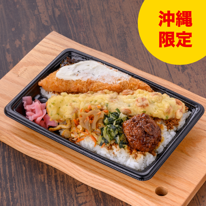 今週のおすすめは「ごはん増量 白身魚フライ&おかず弁当」です。お値段そのままでご飯を20%増量。白身魚フライ・磯辺天・肉団子・五目炒め・青菜・昆布佃煮をトッピングしたお弁当です。