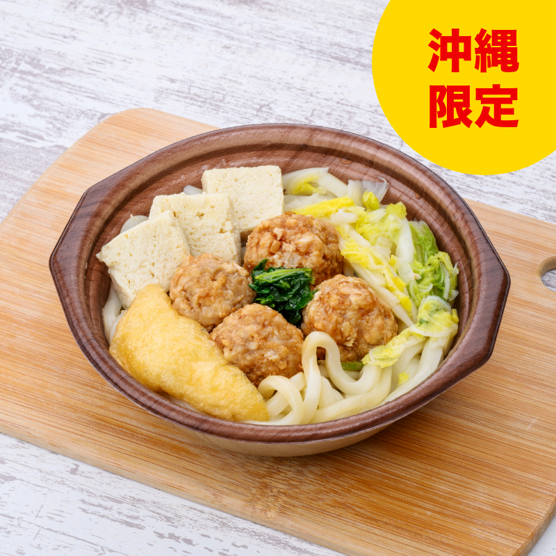 うどん、白菜、島豆腐、葉大根、肉団子、油揚げの具材を使用。鶏ガラベースのあっさりしたスープが特徴の鍋です。