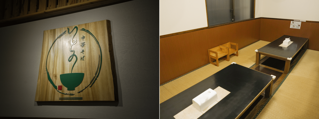 店内に入ると、壁に飾られた温かみのある木彫看板が目をひきます。
