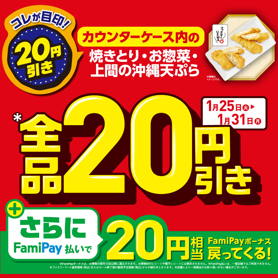 上間の沖縄天ぷら含む常温惣菜(焼きとり・お惣菜)全品20円引き+FamiPayボーナスが戻ってくる!※終了しました。