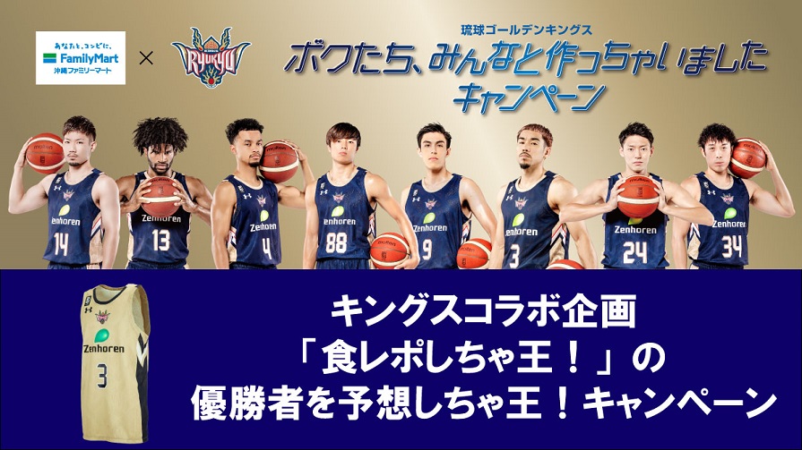 沖縄ファミリーマート公式アカウントTwitterをフォローして、キングスコラボ動画「食レポしちゃ王!」の優勝者を当てた方の中から抽選で、琉球ゴールデンキングスのオーセンティックユニホーム(3選手サイン付き)を1名様にプレゼントいたします。