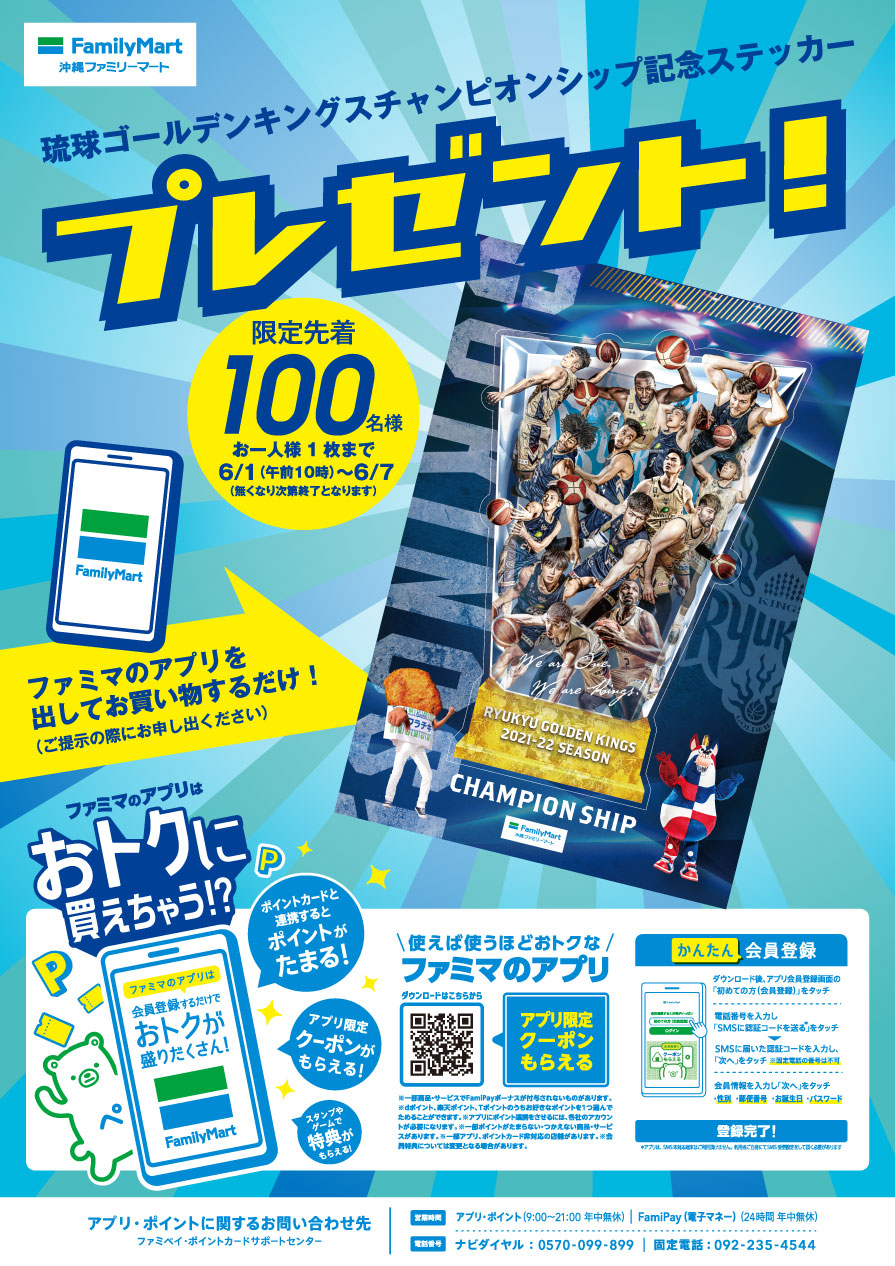 「琉球ゴールデンキングス」ファイナル進出を記念し、キングスと共に寄り添い応援してきましたキングスファンの皆様へ記念ステッカーのプレゼントを企画。県内のファミリーマート各店にて配布致します!