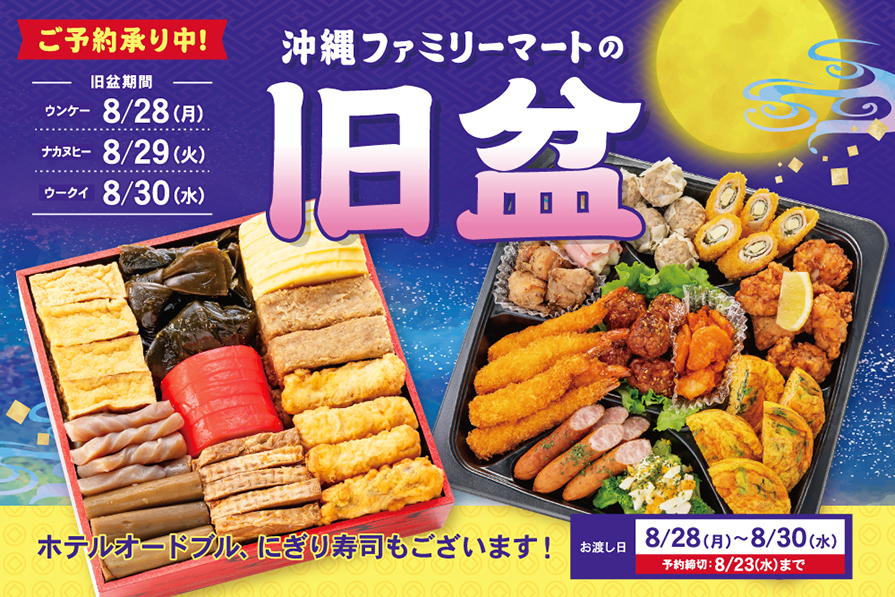 今年の旧盆は8月28 日(月)、29日(火)、30(水)!沖縄重箱、オリジナルのオードブル、ホテルオードブル、ウンケージューシーなど旧盆に対応した商品20アイテムを県内ファミリーマート全店にてご予約承ります。※受付期間は8月23日(水)まで