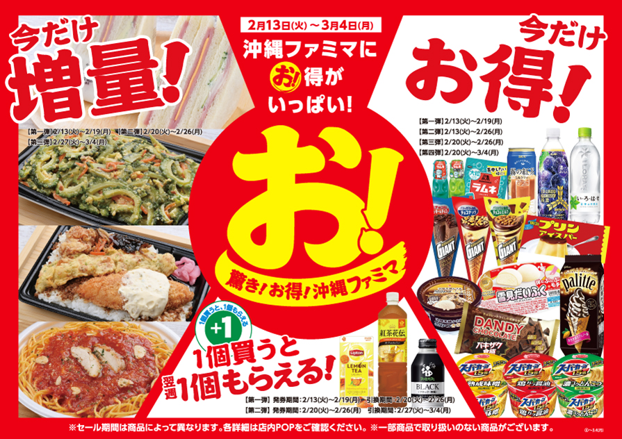 対象の商品増量!対象のアイス、飲料、菓子、カップ麺が今だけお得!2月13日(火)~3月4日(月)までの3週間、沖縄ファミマに「お!」得がいっぱい!